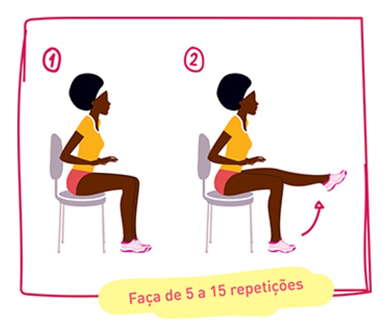 1. Sente-se em uma cadeira e eleve um joelho de cada vez à frente na mesma altura do joelho que vai permanecer flexionado e apoiado no chão. Faça de 5 a 15 repetições.