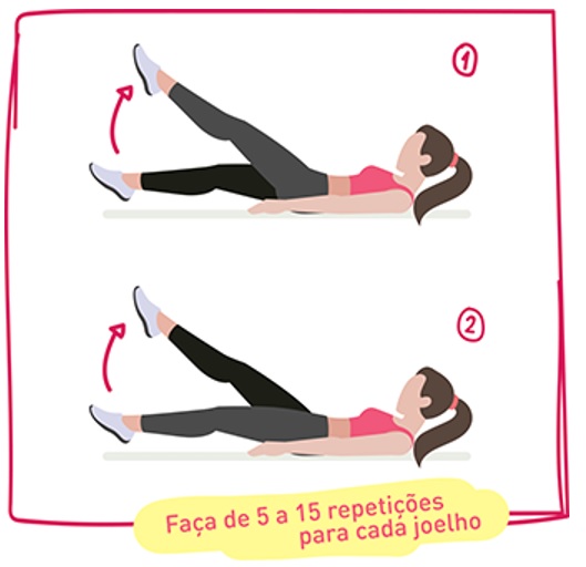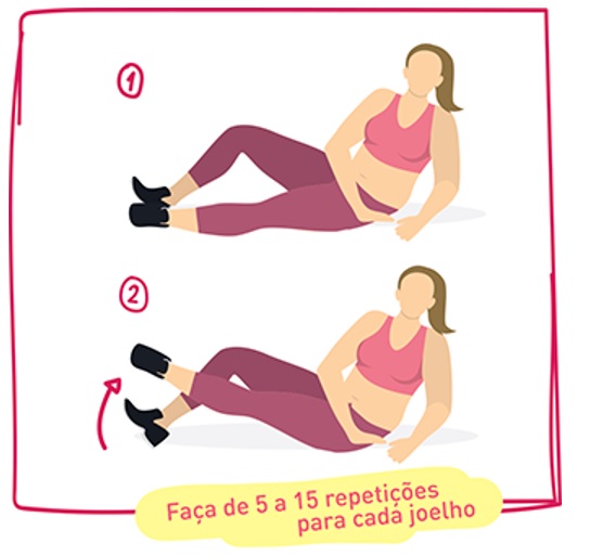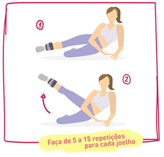 3. Deitado de lado, flexione a perna encostada no solo e eleve a perna “de cima” até o máximo de sua amplitude. Faça de 5 a 15 repetições em cada joelho.
