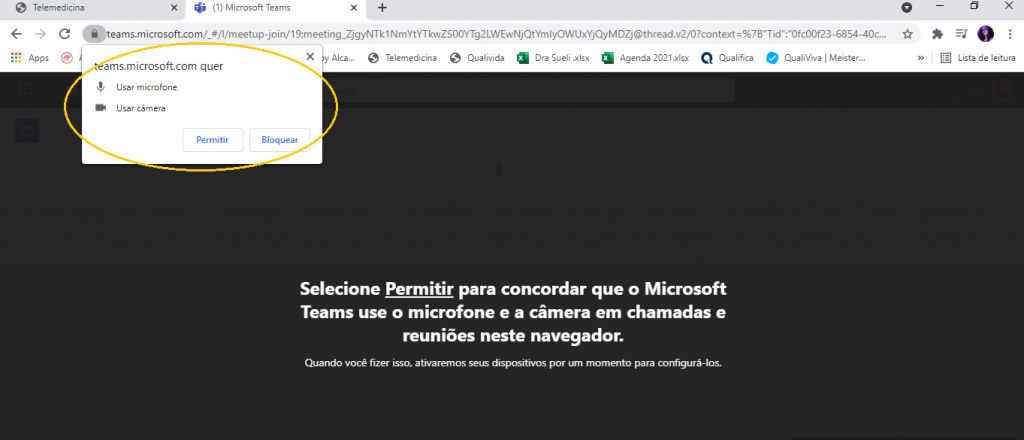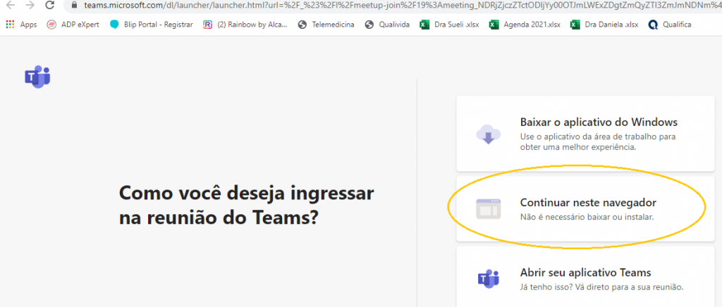 3) Ao clicar no link, você será encaminhado para a reunião, mas não é necessário a instalação do aplicativo no computador, somente a identificação com nome e a permissão ao microfone e câmera para liberação a reunião. Selecione a opção ‘continuar no navegador’ e permita o acesso ao microfone e câmera para conseguir interagir!