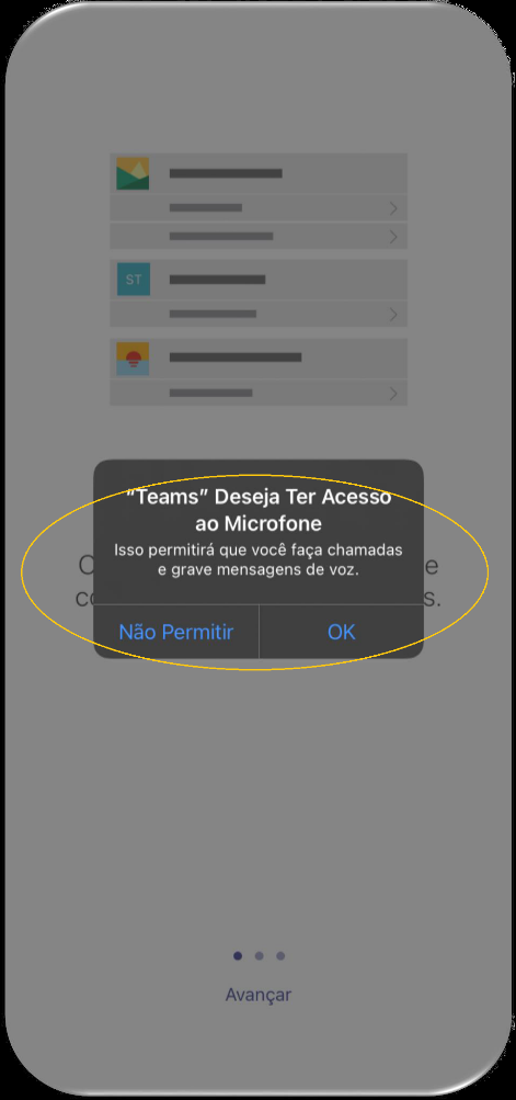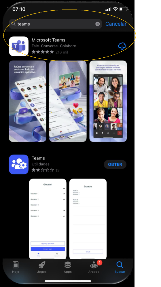 4) O acesso aos encontros também podem ser realizados pelo celular. Para isto, basta acessar seu App Store (poderá estar como Apple Store) para iphones e/ou o Google Play para androides, e procurar por ‘ Teams ’ na barra de pesquisa. Ao instalar, será necessário realizar permissões para acesso ao microfone, câmera, bluetooth e notificações, orientamos que permitam todas em ‘OK’ para acesso aos encontros. Há duas opções para acesso aos encontros.: Acessando como convidado, apenas identificando se com nome completo ou criando uma conta para acesso.