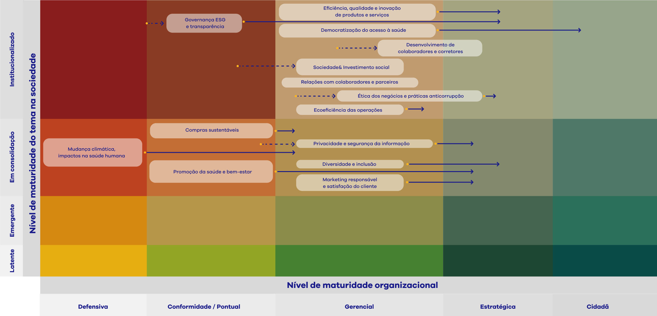 Nossos temas materiais foram dispostos na matriz, representando seu estágio atual de maturidade. A partir desse levantamento, montamos a agenda 2030 com as áreas responsáveis por cada tópico, idealizando nossa ambição em cada tema material.